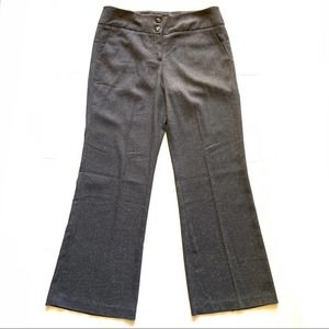 Wide leg trousers in dark gray w/ subtle lighter speckled print. Double button and zip closure. Slant pockets at hips. Unopened back slit pockets. Belt loops. BB2: G