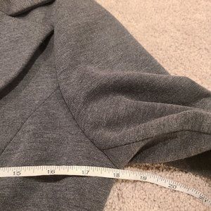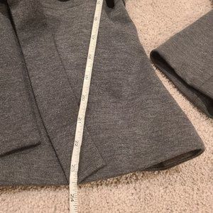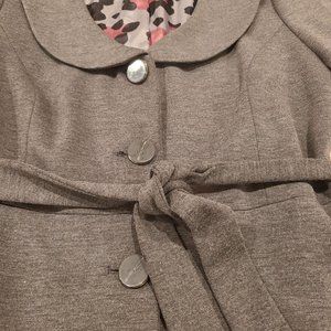 Collared, solid gray color, long sleeves, three button closure in the front, belted, peplum waistline, lined, casual, office