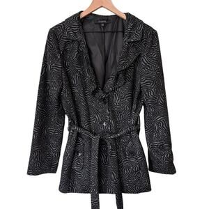 Lined jacket with grey and black design. Long sleeve with tie waist and a ruffle neck edge.
