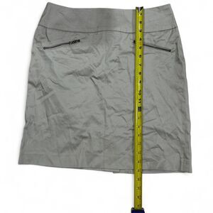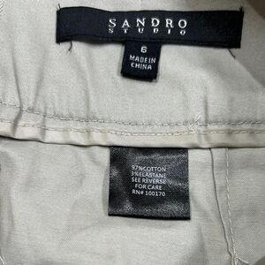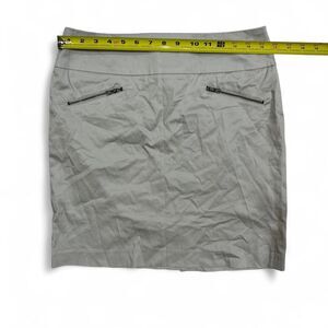 Sandro Studio light grey/beige mini skirt featuring a structured waistband and cool exposed zipper pockets on the front. The fabric has a slight stretch for a comfortable fit.