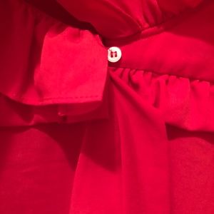 Hot Pink but really more Bright Red Sandro Blouse with ruffle and tie collar combo. Feminine but bold blouse with classic look for work into evening. Great with a suit or jeans. Labeled Size 1 but French manufacture means more size 2 US. %100 Polyester with silk chiffon texture.