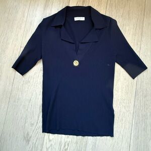 Sandro Ribbed Knit sweater with collar gold button embellishment w v neckline in short-sleeves.