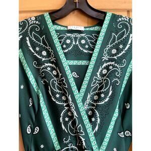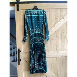 Sandro V Neck Long Sleeve Paisley Print Pleated Midi Dress Green Pattern Small