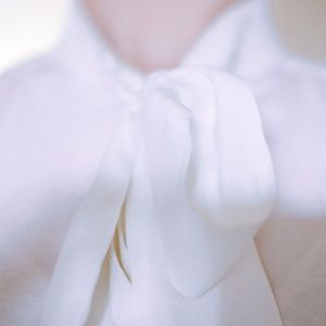 Sandro silk blouse with tie in front that can be turned into a bow—see picture of wear. There is some discoloration in the armpits, please see last photo for reference. Absolutely gorgeous white silk shirt.