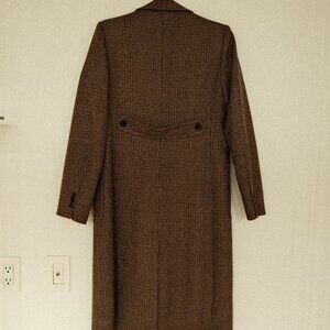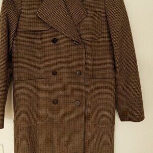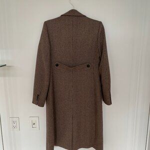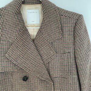 This is a mid-length, authentic Sandro wool coat in a warm-toned plaid. I believe the individual colors of the plaid include tan, black, and burgundy/plum. Fully lined. New without tags—I think I only wore this once, but it's a bit too formal for me. Comes with the original garment bag. Pet-free, smoke-free home. It's a size EU 36, which I believe is equivalent to a US 0/2.