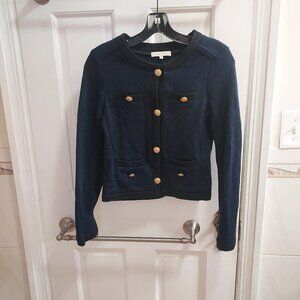 Button up navy cardigan with black contrast and gold embossed buttons