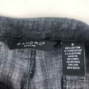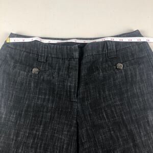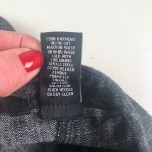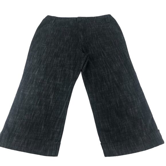 Black and gray in color , zippered closure with button, Two shallow front pockets two pockets in the back , belt loops, Cotton blend