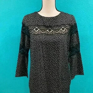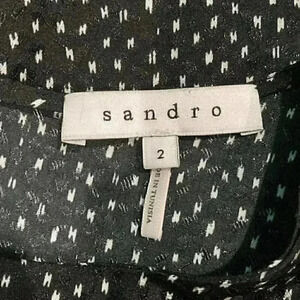 Sandro lace insert dress in size 2. Black and white spots Sandro black lace insert dress with bateau neck, long sleeves and button closure at center back.