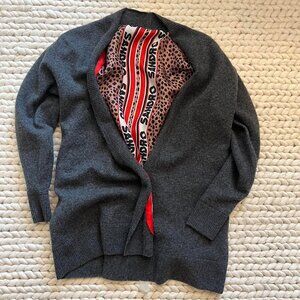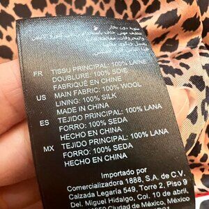 100% wool, 100% silk. Slight snagging on leopard print but not noticeable when wearing.