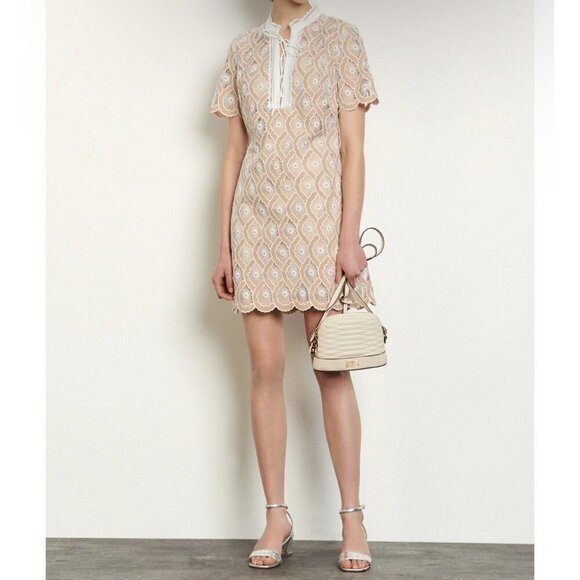 Sandro short broderie anglaise dress, Tan/ white, Size 36