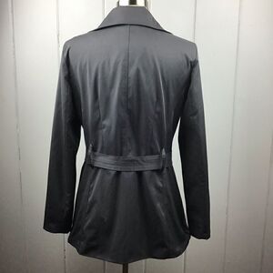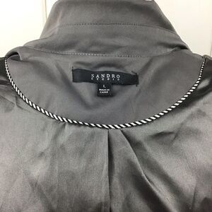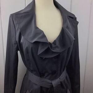 Sandro Studio charcoal gray double breasted trenchcoat w/a unique ruffled collar & belted waistline. Size Large. Coat is lined & has 2 diagonal button-flap pockets in front. 100% polyester. This is simply a beautiful coat in excellent shape!