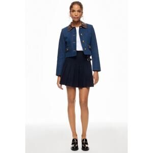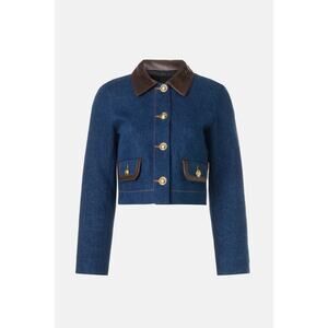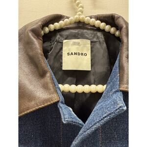 Sandro Denim Jacket With Leather Collar $520 original retail Left side has spots see images Size 36 is size4 Stylist Notes This chic Sandro jacket features a contrasting brown collar and pocket trims, adding a vintage twist to the classic denim look. The cropped cut and golden button details create a preppy vibe. Pair with a high-waisted skirt or trousers for a polished ensemble. Product Info Blue (Main: 100% Cotton; Leather: 100% Lamb; Lining: 100% Polyester). Jackets. Long Sleeve. Front Button Closure. Shoulder to Hemline Length: 19".pit to pit 29”sleeves 24