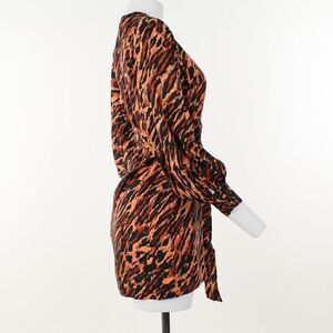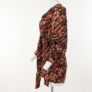 Fashionable tie-waist dress featuring on-trend tiger print. V-neck Button cuffs Long puff sleeves Side zip closure Removable tie belt Silk. Sandro size is 36 which translates to S or 2/4 US