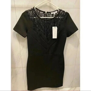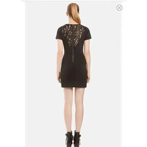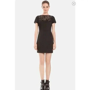 Sheer, lacy scrollwork and zigzagging banding add architectural interest to a go-to little black dress smoothly woven with comfortable stretch.