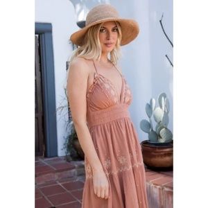 Featured in a forever classic halter neck silhouette with embroidery throughout the dress. Smocking at the waistline for comfy and added shape. Effortless pull-on style maxi dress. Very feminine silhouette. Bohemian and romantic style perfect for a casual summer day or your next vacation!