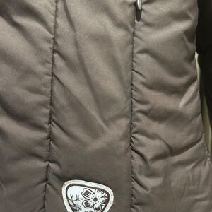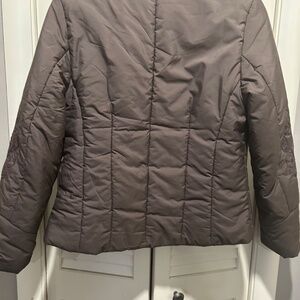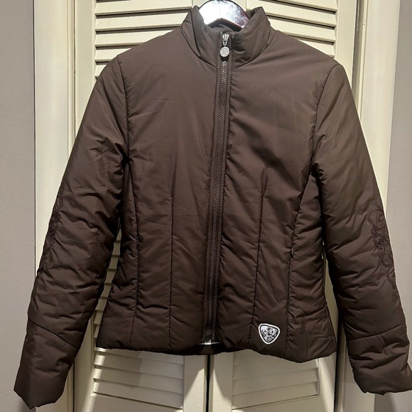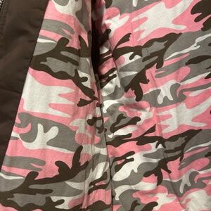 Stylish SZ Medium Women's/Juniors Sandy Elliott short insulated jacket in brown with inner pink/brown/gray camouflage lining and duo hidden zippered pockets on the sides. This cute full zip jacket was only worn 2x!