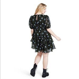 Description Swing into the Floral-Print Short Sleeve Tiered Dress from Sandy Liang x Target for a sweet twist to your everyday dress. This short-sleeve dress comes in black with an allover print of white polka dots and blue florals for a fun yet super wearable look. Puff sleeves and a tiered bodice come together to give the dress extra shaping, complete with ruffles adorning each tier for extra flounce. In a mini length, this dress looks great worn on its own during the warmer months, and then layered with tights for cold-weather style. A slim keyhole cutout behind the neck puts a polished touch, as well as tie closures for a neat finish.