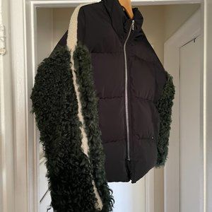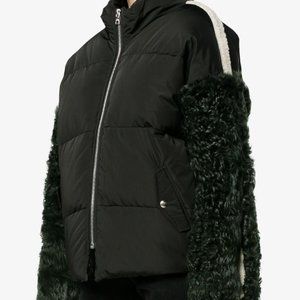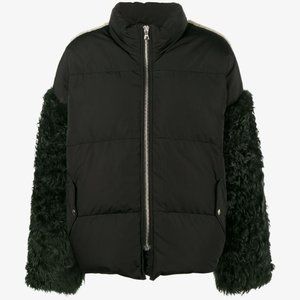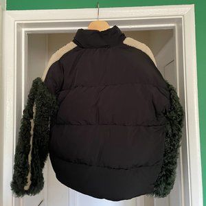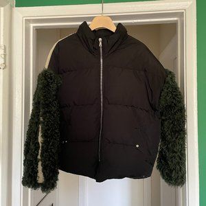 Beautiful and rare Sandy Liang 'Eldridge' black puffer jacket with green shearling sleeves. The puffer style silhouette is crafted from black polyester that has insulated padding, a high neck collar, a metal zip-up front, short hem, slanted button popper pockets, long sleeves with lamb shearling stripe through deep green shearing