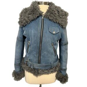 Sandy Liang Skyla Suede Jacket Blue Size 40 (U.S 4) Fur Trim Buckle Accents