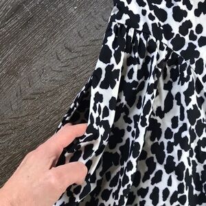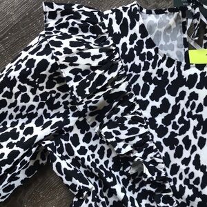 Allover leopard print in black and white, lavender accent Features gathered side panels and ruffle insets