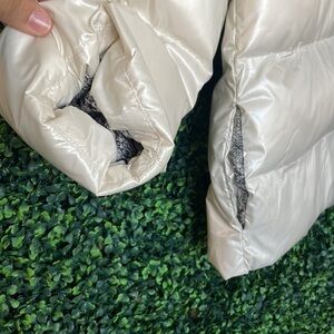 This is the awesome cream or ivory color puffer jacket with snake skin detailing and lining. This has a zipper and button closure with pockets on the side. This is new w tags there is nothing wrong with it.