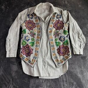 Matching skirt and top set, showcasing a unique blend of vintage charm and artisanal craftsmanship. The ensemble features a button-down shirt and an A-line skirt, both adorned with vibrant floral embroidery and delicate sequin accents. The striped pattern provides a subtle backdrop for the colorful embellishments, creating a visually appealing contrast. The set offers a comfortable and breathable fit, perfect for making a statement with its eye-catching details and distinctive style. This unique outfit is ideal for garden parties, casual outings, or adding a touch of bohemian flair to your everyday wardrobe.