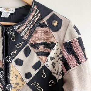 Vintage 80’s Sandy Starkman Art-to-Wear Jacket, featuring long sleeves, boho mixed media patchwork including embroidery, wool patches, beading, and crochet patterns, thick wool blend material, full interior lining, button front closure, cropped length, boxy silhouette. Color: black,tan, and cream.