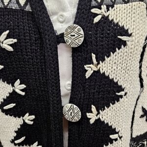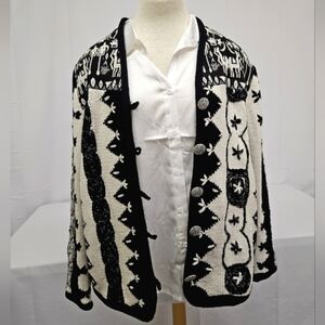 Stylish black and Off White cardigan with intricate patterns. Features unique button details.