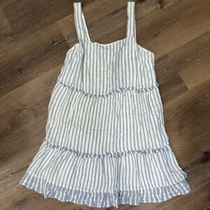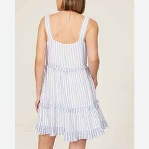 Stylish mini dress with blue and white stripes. Sleeveless design. Ideal for casual wear.