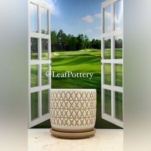 Dimensions: 6”H x 6”W, Opening 5.25”, weight 3lbs , Materials: Ceramic, Drainage hole,Saucer Attached to the planter, Type: Barrel Planter, Made in China , Color: White & Beige , Perfect for Indoor/Outdoor gardening, Don’t forget to dress up your plants 🪴