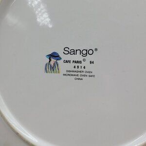 Vintage Sango "Café Paris" decorative plate, pattern 4914, dated ©1994. Features a charming Parisian café scene with two women in hats enjoying tea. Made of fine china with original luster and clarity intact. No chips, cracks, scratches, or discoloration. Dishwasher, oven, and microwave safe.