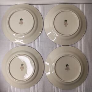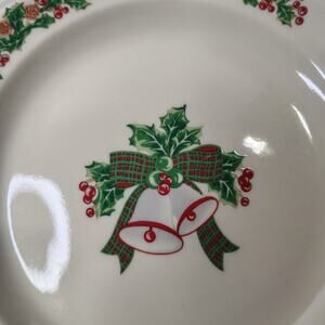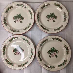 Sango Jingle Bells Pattern 7 1/2" Stoneware Salad Dessert Plates. Flared rim. Vintage 1989. Off white with white bells, green holly, red berries. Red line around rim. In original box. Preowned excellent condition with no chips, cracks or crazing. Box has lots of shelf wear but still holds the plates securely. From a non-smoking home.