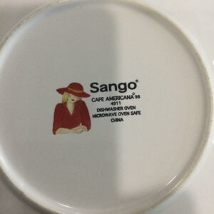 Sango Cafe Americana Plate. No chips or cracks. Light scratches in finish from use and a larger scratch near man’s hat in blue color.