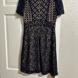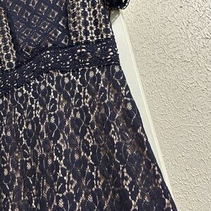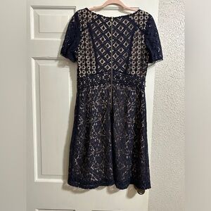 Gently used. Smoke free home. This is a knee-length “Sangria" brand fit and flare dress in a navy blue lace overlay with a nude underlay. The dress features short sleeves, a scoop neckline, and a fitted bodice with a cinched waist. The lace pattern includes diamond and floral motifs.