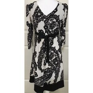 Sangria Paisley Print Dress V-Neck 3/4 Sleeve Black White Elegant Comfy Size 8