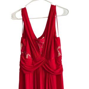Striking red sleeveless dress by Sangria, size 14. Features a deep V-neckline, gathered waist with twist detail, and sheer lace panels along the bodice for added elegance. The flowing fabric and flattering silhouette make it perfect for formal events, weddings, or holiday parties. Lightweight and comfortable with a dramatic look. Made in China. Gently used and in excellent condition—see photos for full detail.
