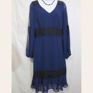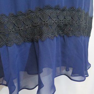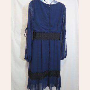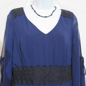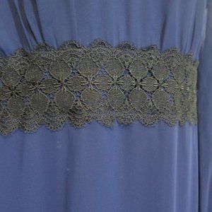 Sangria v-neck lace trimmed cold shoulder dress. Sheer blue material with black lining. Only worn a few time. Sleeves are cold shoulder, with slits and ties. Super pretty for a special occasion. Dog loving, smoke free home.