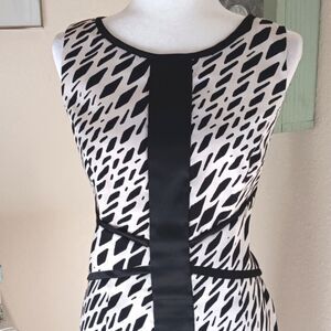 Stylish black and white patterned dress by Sangria. Geometrics? Reflections on water? Bold black trim at boatneck down the front, under chest and over hips. Fitted bodice with princess seams. So flattering! Slightly stretchy. Size 12 measures 41 at chest. 34 at waist. 42 at hips. 40.5 long from shoulder to hem. This bold design is dramatic and unique. A brave choice.