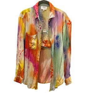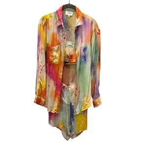 A vibrant three-piece ensemble from Sani’s resort collection, inspired by the Holi festival of colors. This lightweight satin-finish set includes a cropped tank, relaxed button-down shirt, and coordinating shorts in a vivid rainbow tie-dye print. Effortlessly chic for travel, lounging, or statement styling.