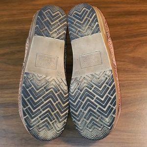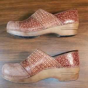 Tan & brown embossed suede and leather slip on professional clogs by Sanita. Perfect for jobs that have you on your feet, like nursing.