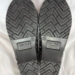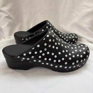 Stylish Sanita clogs with a black base and white polka dots. Comfortable and chic design.