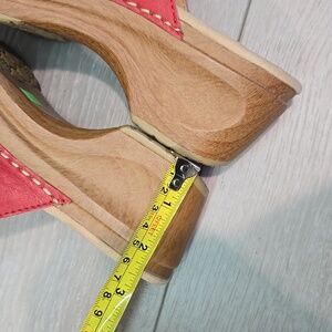 Elegant red leather mules with wooden sole. Stylish buckle accents. Perfect for casual outings.