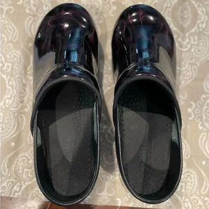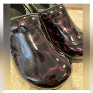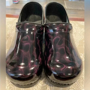 Very gently worn pair of Sanita Black and Purple Swirl Patent clogs in size 40/9. Please see sizing chart. Minor signs of wear, small scuffs mostly on back of shoes. Smoke free home. These are my own shoes and have been stored appropriately.