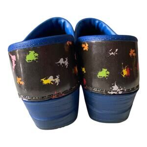 Description: Sanita Clogs Women's Paint Ball Color Leather Slip-Ons Size EU 35 US4 Nurse Shoes. Soles are in good condition. No rips or tears. There is some light peeling and scuffs present. Lots of life left!