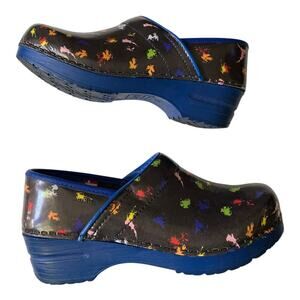 Description: Sanita Clogs Women's Paint Ball Color Leather Slip-Ons Size EU 35 US4 Nurse Shoes. Soles are in good condition. No rips or tears. There is some light peeling and scuffs present. Lots of life left!