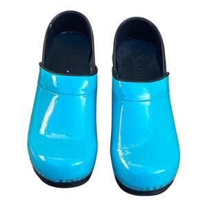 Description: Gently worn, Sanita Clogs Women's Turquoise Patent Leather Slip-On Nurse Shoes Size EUR 35. Soles are in good condition. No peeling, rips, or holes. Lots of life left. Worn a few times only. There is a pin-sized flaw on the back of one shoe (see picture 13)