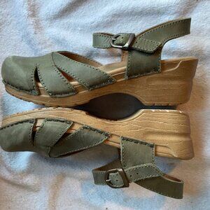 Sanita Margrethe Sandals Leather size 36 6 Khaki Clogs Wood Heel Green Beige