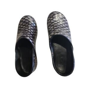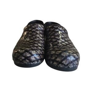 Sanita Professional Dory Danish Clogs in Black. Size 38 (US 6.5-7). Features round toe, flat heel, patent leather upper, and slip-on style. Excellent pre-owned condition.