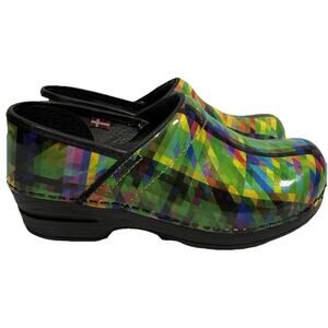 Bright and bold pair of Sanita Professional clogs, size 37 (fits US women’s 6.5–7). These feature a striking multicolor geometric design with a glossy finish, making them both functional and fun. Known for comfort, support, and durability, Sanita clogs are a favorite for workwear or all-day wear. Excellent condition with only very light wear on soles.