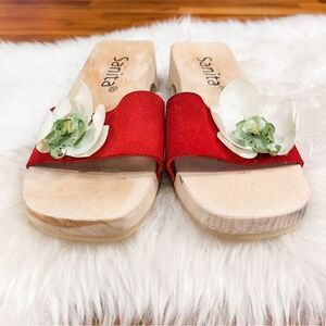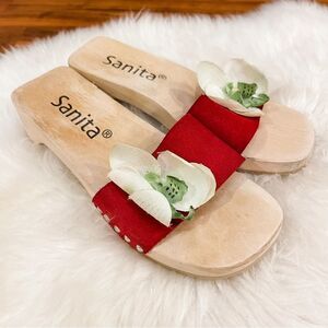 Super cute Sanita Women’s Wood Sandals with Leather Strap & Orchid Detail. Excellent pre-owned condition! See pics for signs of wear.